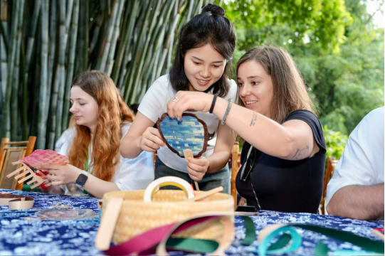 研学活动紧扣“文明探源”“生态宜居”“乡村振兴”“非遗传承”等主题,留学生们参访了乐山大佛景区、三星堆博物馆、金沙遗址博物馆,探寻文化遗产与古蜀文明;在德阳市旌阳区欣赏了川剧变脸,在高槐村体验了潮扇扎染技艺,感知非遗工坊活态传承;在眉山市青神县体验了竹编非遗;在简阳市平武镇体验手工月饼制作,并参观了现代花卉基地;另外,留学生们还参访了成都环境监测大楼,感受公园城市的生态智慧。