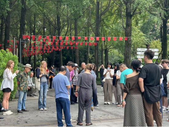 10月9日,四川大学海外教育学院汉语实践活动于成都市人民公园顺利开展。在邓波老师的带领下,29名留学生走入这座古老而悠久的风景园林历史公园,沉浸式体验成都特有的“慢生活”氛围。这次实践活动,同学们漫步于绿意盎然与市井喧嚣相融的人民公园,不仅在鲜活的情景中锻炼了汉语口语能力,更真切品味到这座城市闲适包容的人文气质。