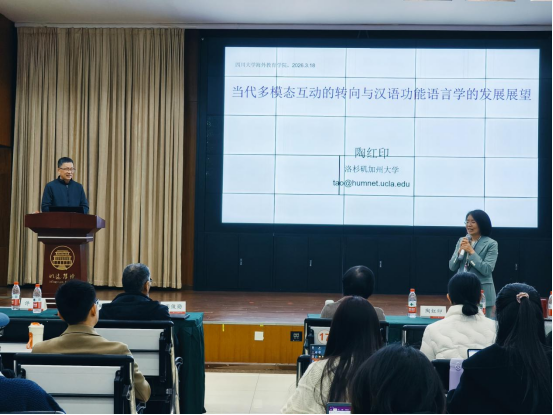 2026年3月18日,美国加州大学洛杉矶分校亚洲语言文化系陶红印教授应邀来校作题为“当代多模态互动的转向与汉语功能语言学的发展展望”的前沿讲座。讲座由四川大学海外教育学院鲜丽霞教授主持。来自四川大学、西南科技大学及四川师范大学等院校的师生参加了此次讲座。