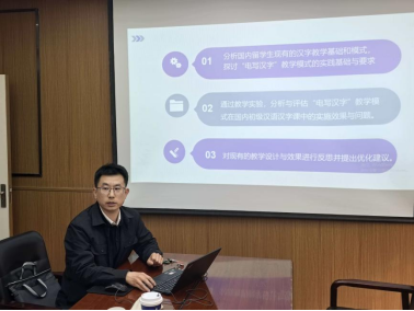 张杰老师围绕《“电写汉字”在留学生汉字教学中的实践与探索研究》项目进行汇报。该项目聚焦留学生汉字教学创新,目前已完成电写汉字实践基础与要求的系统分析。后续项目组将持续深耕研究,计划发表相关论文、参与学术会议,并将研究成果积极投入教学实践,助力提升留学生汉字学习效率与效果。
