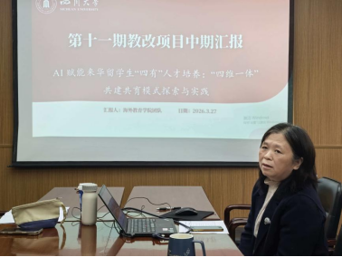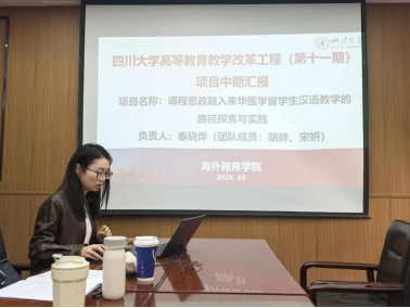 2026年3月27日下午,四川大学海外教育学院举办教师教学发展暨基层教学组织活动,组织开展高等教育教学改革项目工程(第十一期)研究项目中期检查交流,全面梳理各教改项目实施进展,总结阶段性成果,研判存在问题,明确后续推进方向。学院全体教职工参加了会议。会上,9位项目负责人依次围绕各自项目的实施背景、针对性、中期成果及后续工作计划进行了汇报,充分展现了学院在国际中文教育教学改革领域的探索与实践,为后续项目高质量推进奠定坚实基础。