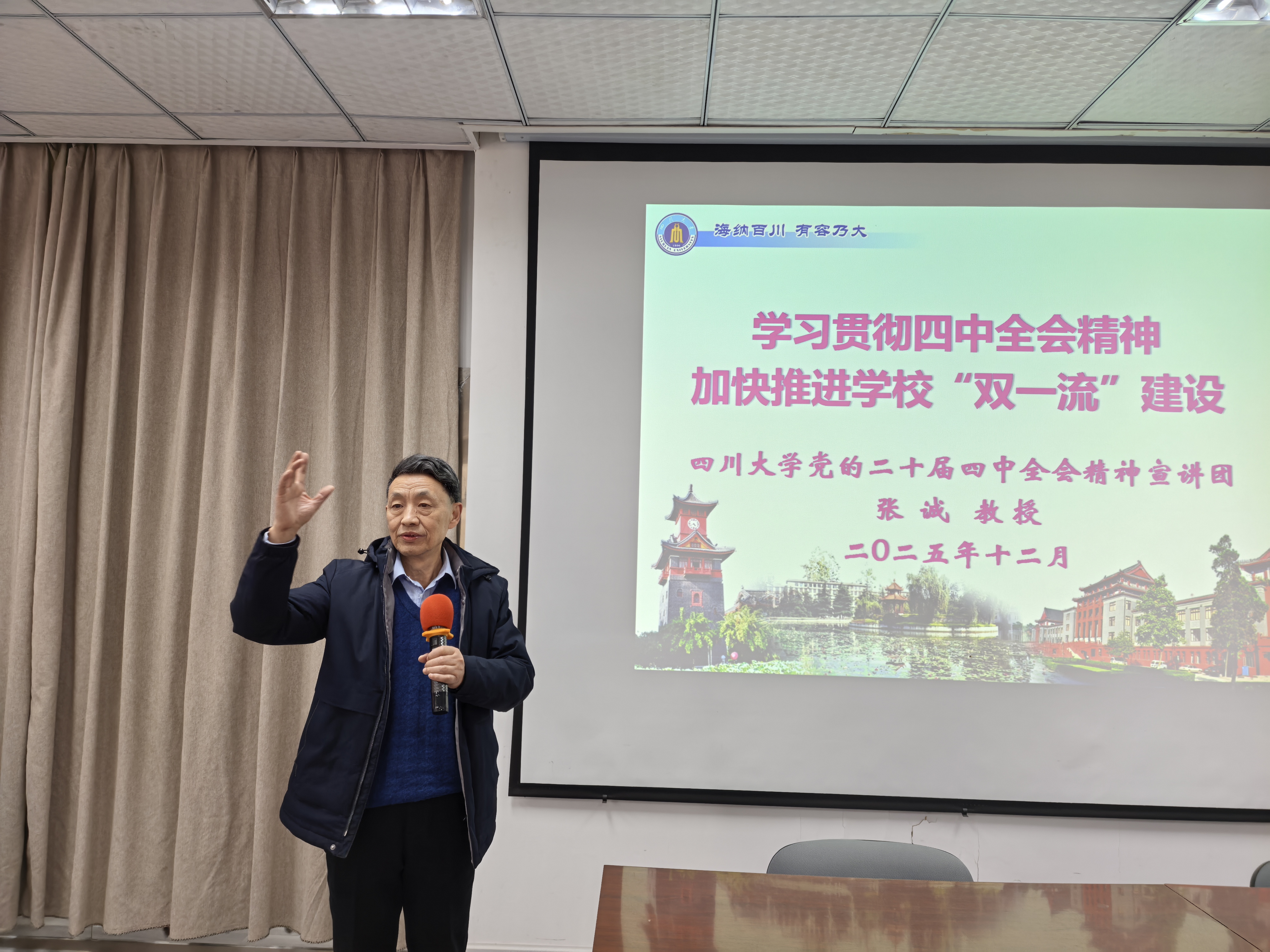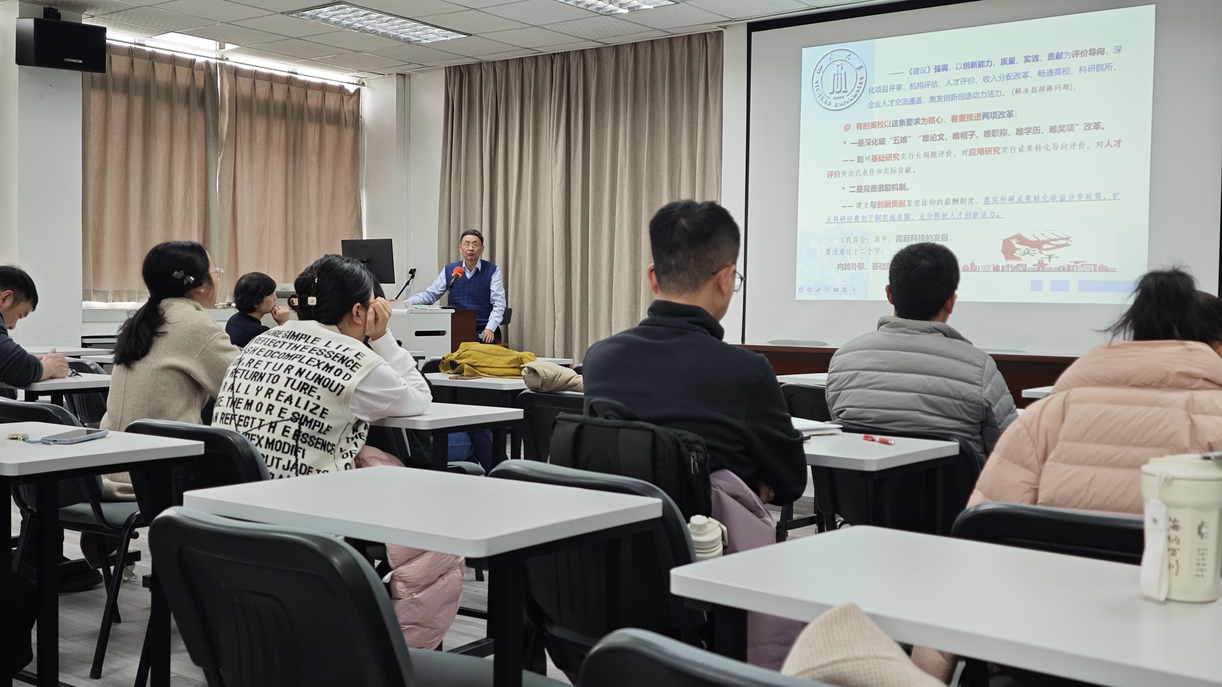 最后,信息化建设与管理办公室副主任兼党支部副书记黎生代表与会两个单位同志感谢张诚教授的精彩宣讲。他说,张诚教授的宣讲既全面深入、又突出重点,既有理论高度、又紧密联系基层实际,对于我们深入学习贯彻落实全会精神,把握好学校制定的“十五五”“1+6+N”规划体系的相关部署,谋划好本单位“十五五”高质量发展的基本思路、目标任务、重点举措和要素保障都具有很好的指导启发作用。他强调,深入学习贯彻党的二十届四中全会精神是我们当前和今后一个时期的首要政治任务,我们参会两个单位的党政干部和教职员工都要深入学习、深刻领会全会精神的核心要义,紧密结合学校党政的相关部署,立足本单位的工作领域与岗位职责,真抓实干,确保“十五五”开好局、起好步,为早日实现中国式现代化的新蓝图,加快推进学校“双一流”建设做出我们应有的贡献!