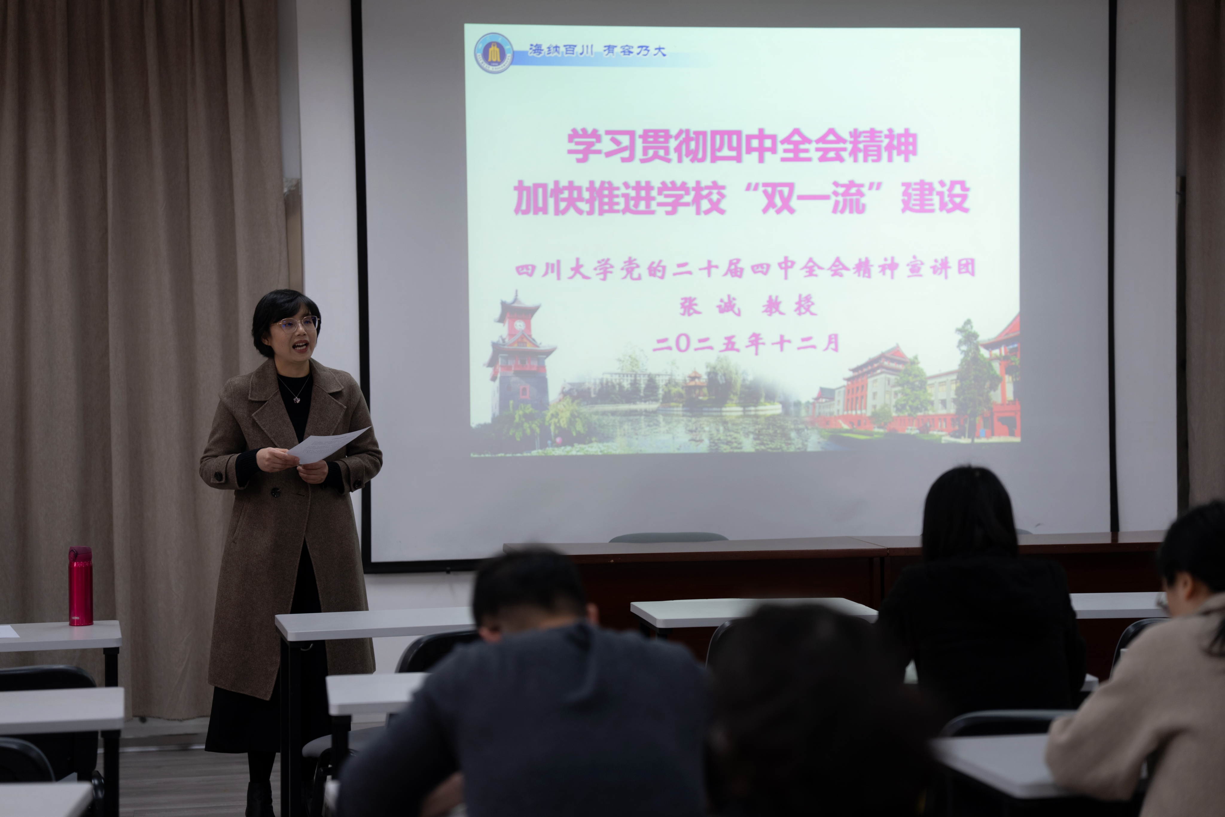 张诚以“学习贯彻四中全会精神,加快推进学校‘双一流’建设”为题,紧密联系我国 “十四五”取得的新成就,着重宣讲了全会对“十五五”时期经济社会发展的重大意义、形势判断、指导思想、重大原则、战略任务、重大举措和根本保证等一系列新论述、新部署、新要求。他还结合学校“十四五”取得的新成就和两个听讲单位的实际,分别对海外教育学院和信息化建设与管理办公室深入学习贯彻四中全会精神,以高质量的党建引领保障本单位落实好全会提出的相关重要部署,以及学校“十五五”规划体系明确的相关重要任务,力争在智能化转型、特色化塑造、国际化提升、教育科技人才一体发展上尽快取得新成效提出了若干工作建议。